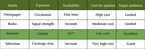 In rich countries the Internet is claiming a growing share of advertising – at the expense of traditional media, such as TV and print. Some of the great advantages of the Internet are that it has no boundaries and can be accessed in a matter of seconds. You can enter new markets all over the world with minimal costs; you can reach customers all over the world; and the web allows you to market your products or services to your clients or potential customers 24 hours a day, 7 days a week.